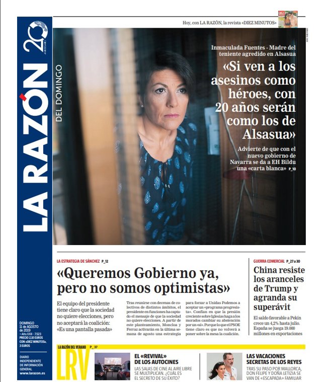 LA RAZÓN: "Inmaculada Fuentes, madre del teniente agredido en Alsasua: 'Si ven a los asesinos como héroes, con 20 años serán como los de Alsasua'. Advierte de que con el nuevo gobierno de Navarra se da a EH Bildu una 'carta blanca'"; La estrategia de Sánchez. 'Queremos Gobierno ya, pero no somos optimistas'"; "China resiste los aranceles de Trump y agranda su superávit".