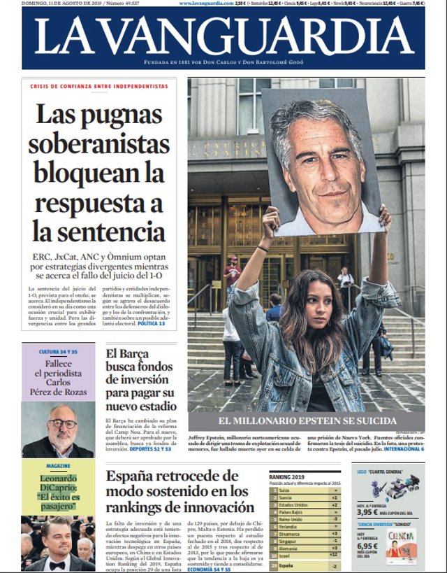 LA VANGUARDIA: "Las pugnas soberanistas bloquean la respuesta a la sentencia"; "El millonario Epstein se suicida"; "El Barça busca fondos de inversión para pagar su nuevo estadio"; España retrocede de modo sostenido en los rankings de innovación"; "Fallece el periodista Carlos Pérez de Rozas"; "Leonardo DiCaprio: 'El éxito es pasajero'".