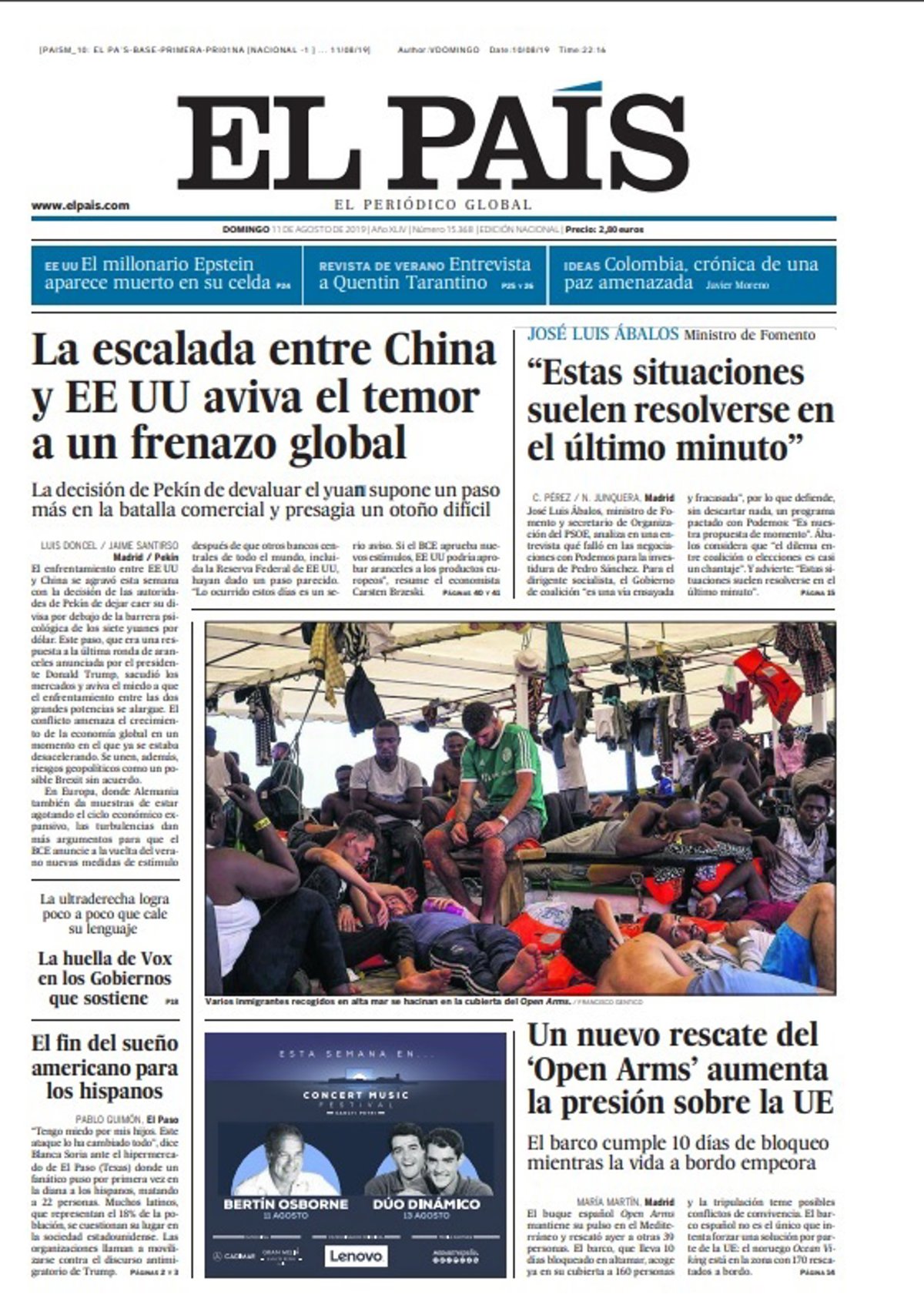 EL PAÍS: "La escalada entre China y EE UU aviva el temor a un frenazo global"; "José Luis Ábalos, ministro de Fomento: 'Estas situaciones suelen resolverse en el último minuto'"; "Un nuevo rescate del 'Open Arms' aumenta la presión sobre la UE. El barco cumple 10 días de bloqueo mientras la vida a bordo empeora"; "La huella de Vox en los Gobiernos que sostiene"; "El fin del sueño americano para los hispanos".
