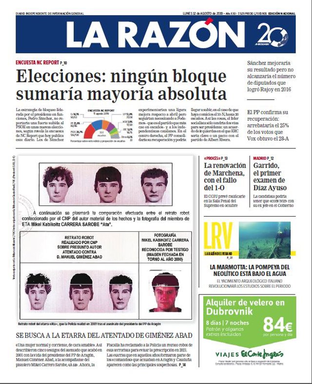 LA RAZÓN: 'Elecciones: ningún bloque sumaría mayoría absoluta'; 'Se busca a la etarra del atentado de Giménez Abad'; 'La renovación de Marchena, con el fallo del 1-O'; 'Garrido, el primer examen de Díaz Ayuso'.