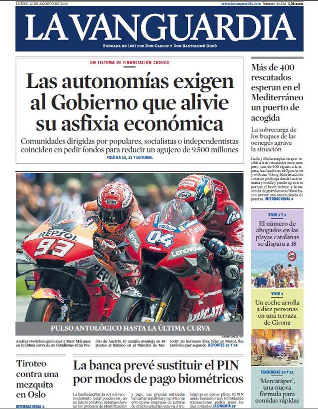 LA VANGUARDIA: 'Las autonomías exigen al Gobierno que alivie su asfixia económica'; 'Más de 400 rescatados esperan en el Mediterráneo un puerto de acogida'; 'La banca prevé sustituir el PIN por modos de pago biométricos'.