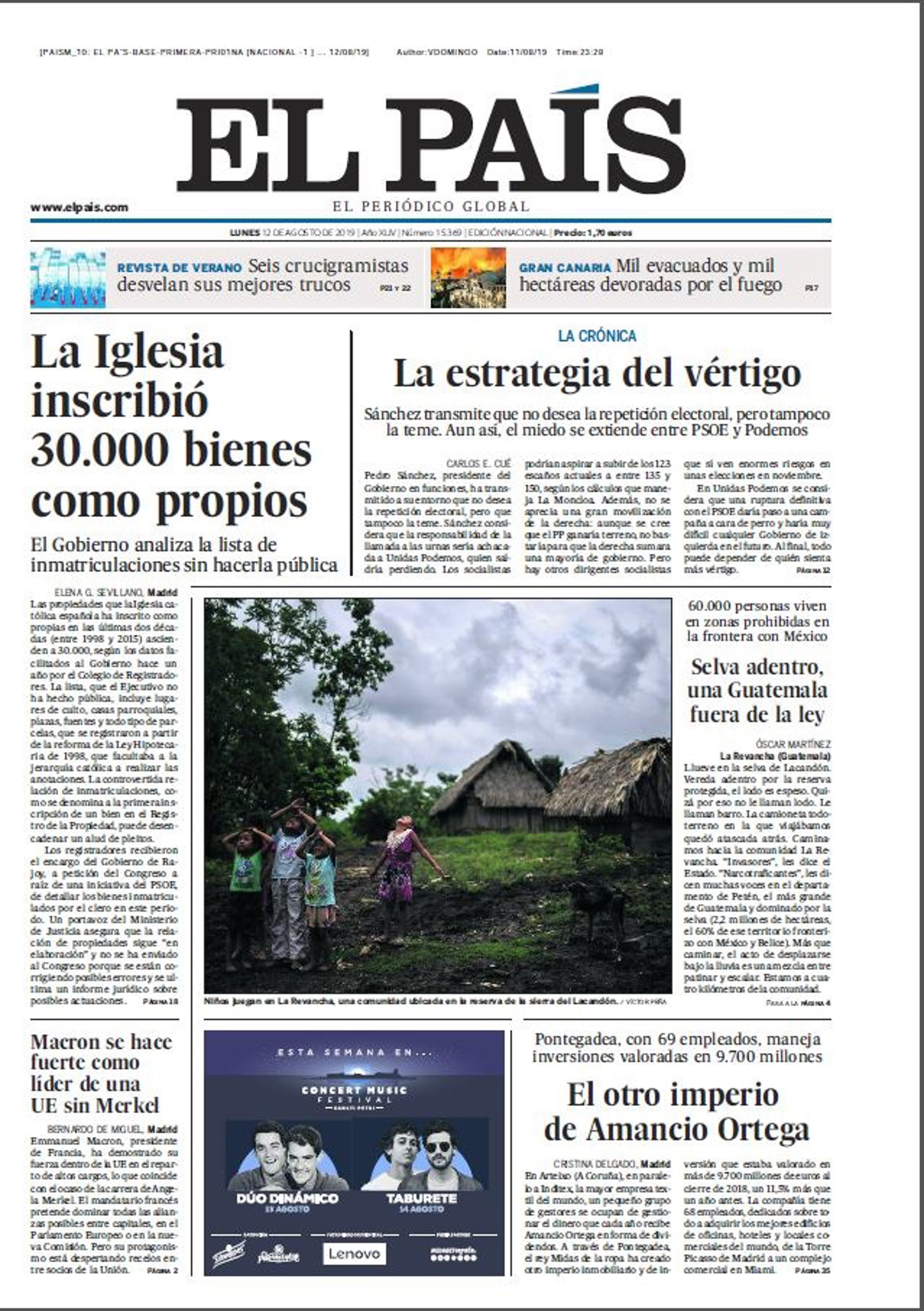 EL PAÍS: 'La Iglesia inscribió 30.000 bienes como propios'; 'La estrategia del vértigo'; 'Macron se hace fuerte como líder de una UE sin Merkel', 'El otro imperio de Amancio Ortega'.