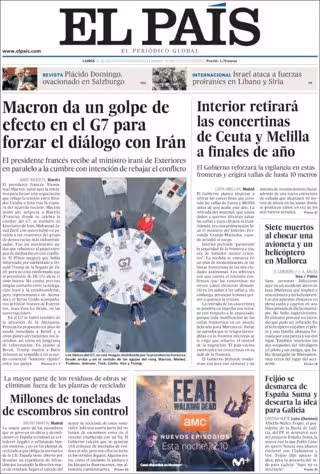 EL PAÍS: "Macron da un golpe de efecto en el G7 para forzar el diálogo con Irán"; "Interior retirará las concertinas de Ceuta y Melilla a finales de año"; "Millones de toneladas de escombros sin control"; "Siete muertos al chocar una avioneta y un helicóptero en Mallorca"; "Feijoo se desmarca de España Suma y descarta la idea para Galicia".