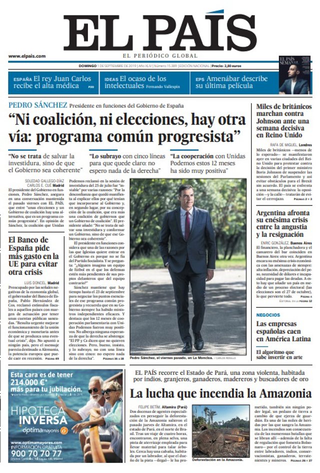 EL PAÍS: Entrevista a Pedro Sánchez: "Ni coalición, ni elecciones, hay otra vía: programa común progresista"; "Miles de británicos marchan contra Johnson ante una semana decisiva en Reino Unida"; "El Banco de España pide más gasto en la E para evitar otra crisis"; "Argentina afronta su enésima crisis entre la angustia y la resignación"; "Las empresas españolas caen en América Latina"; "La lucha que incendia la Amazonia".