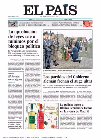 EL PAÍS: "La aprobación de leyes cae a mínimos por el bloqueo político"; "Los partidos del Gobierno alemán frenan el auge ultra"; "El Senado como ágora"; "La policía busca a Blanca Fernández Ochoa en la sierra de Madrid"; "Iglesias responde a Sánchez en un tuit que apela a la santa paciencia".