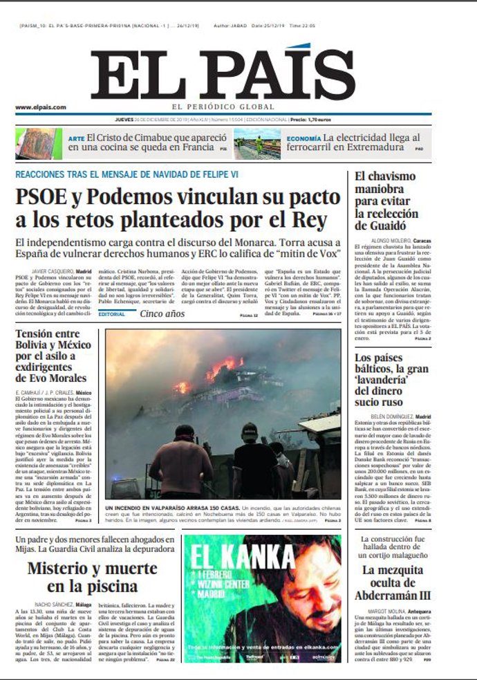 EL PAÍS: "PSOE y Podemos vinculan su pacto a los retos planteados por el Rey"; "El chavismo maniobra para evitar la reelección de Guaidó"; "Tensión entre Bolivia y México por el asilo a exdirigentes de Evo Morales"; "Misterio y muerte en la piscina"; "Los países bálticos, la gran 'lavandería' del dinero sucio rusio"; "La mezquita oculta de Abderramán III".