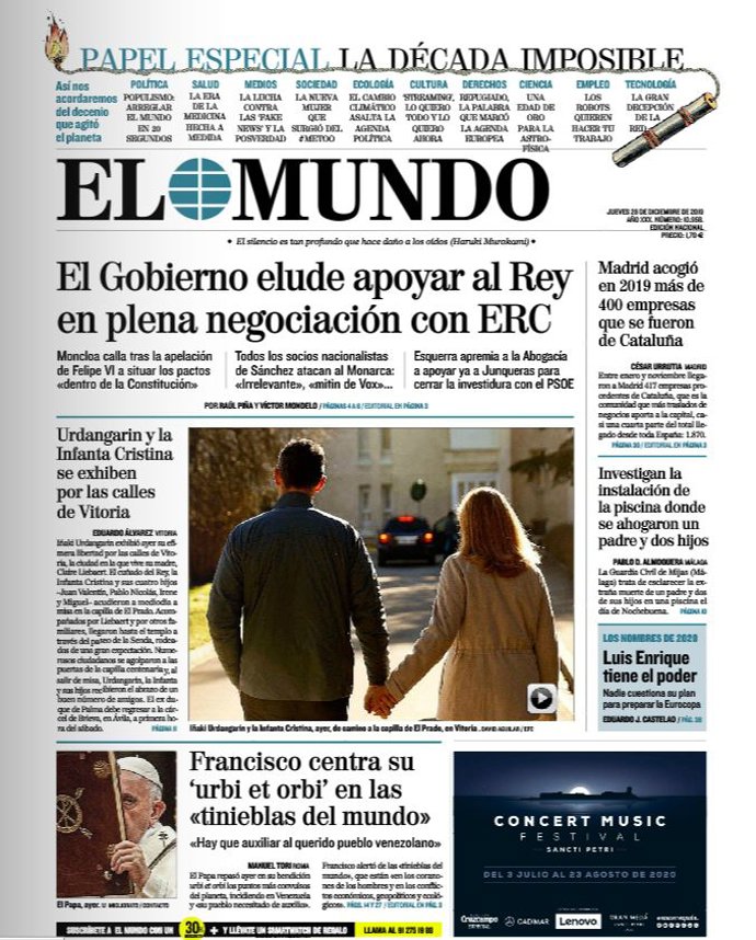 EL MUNDO: "El Gobierno elude apoyar al Rey en plena negociación con ERC"; "Urdangarín y la Infanta Cristina se exhiben por las calles de Vitoria"; "Francisco centra su 'urbi et orbi' en las "tinieblas del mundo"; "Madrid acogió en 2019 más de 400 empresas que se fueron de Cataluña"; "Investigan la instalación de la piscina donde se ahogaron un padre y dos hijos".