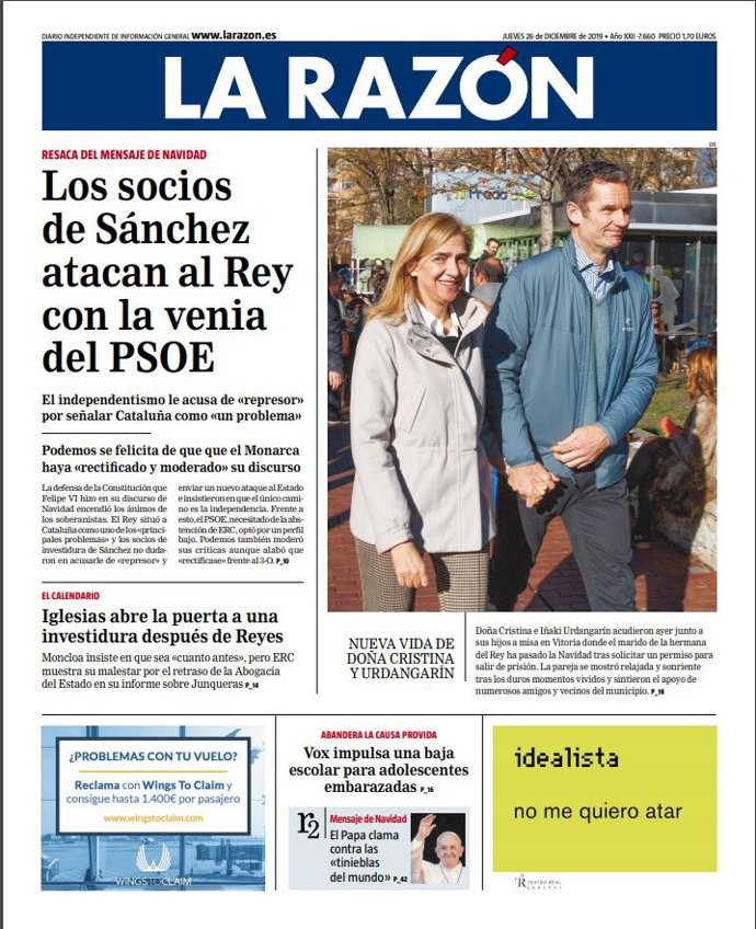 LA RAZÓN: "Los socios de Sánchez atacan al Rey con la venia del PSOE"; "Iglesias abre la puerta a una investidura después de Reyes"; "Nueva vida de Doña Cristina y Urdangarín".