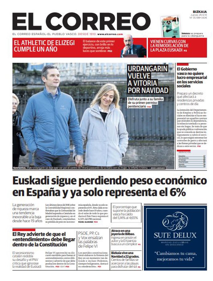 EL CORREO: "Euskadi sigue perdiendo peso económico en España y ya solo representa el 6%"; "El Rey advierte de que el "entendimiento" debe llegar dentro de la Constitución"; "El Gobierno vasco no quiere lucro empresarial en los servicios sociales".