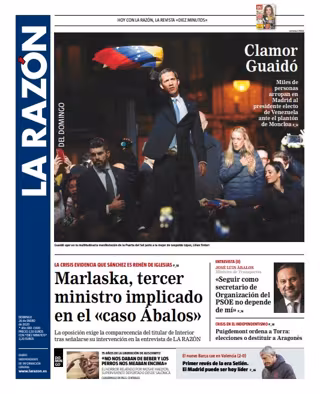 LA RAZÓN: "Clamor Guaidó: Miles de personas arropan en Madrid al presidente electo de Venezuela ante el plantón de Moncloa"; "Marlaska, tercer ministro implicado en el caso Ábalos"; "Ábalos: Seguir como secretario de Organización del PSOE no depende de mí"; "Moshe Haelyon: No nos daban de beber y los perros nos meaban encima"; "Puigdemont ordena a Torra: elecciones o destruir a Aragonès"; "Primer revés de la era Setién. El Madrid puede ser hoy líder".