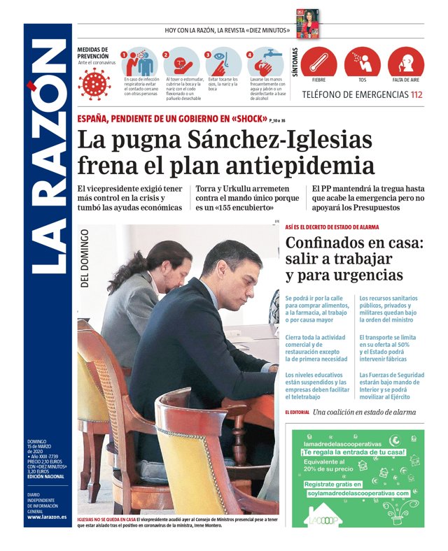 LA RAZÓN: "La pugna Sánchez-Iglesias frena el plan antiepidemia"; "El vicepresidente exigió tener más control en la crisis y tumbó las ayudas económicas"; "Torra y Urkullu arremeten contra el mando único porque es un "155 encubierto""; "El PP mantendrá la tregua hasta que acabe la emergencia pero no apoyará los Presupuestos"; "Confinados en casa: salir a trabajar y para urgencias".