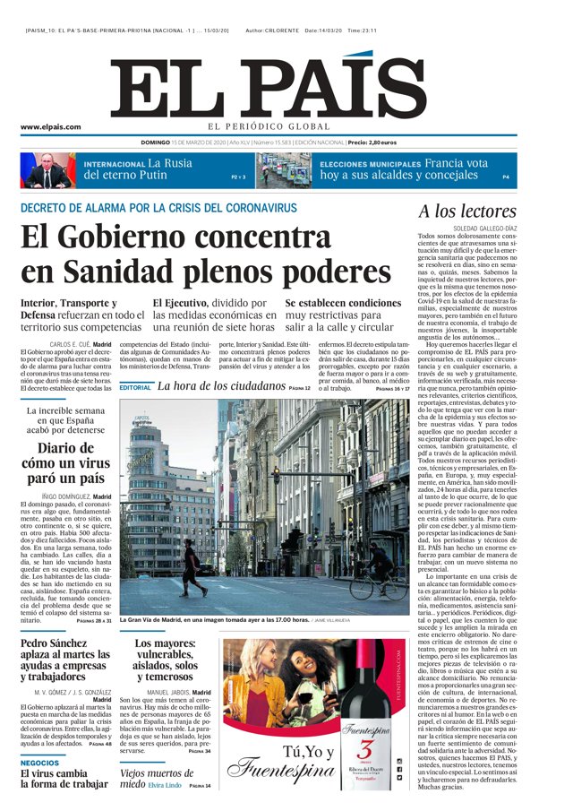 EL PAÍS: "El Gobierno concentra en Sanidad plenos poderes"; "Diario de cómo un virus paró un país"; "La hora de los ciudadnos"; "Pedro Sánchez aplaza al martes las ayudas a empresas y trabajadores"; "Los mayores: vulnerables, aislados, solos y temerosos"; "El virus cambia la forma de trabajar"; "Viejos muertos de miedo"; La Rusia del eterno Putin"; "Francia vota hoy a sus alcaldes y concejales".