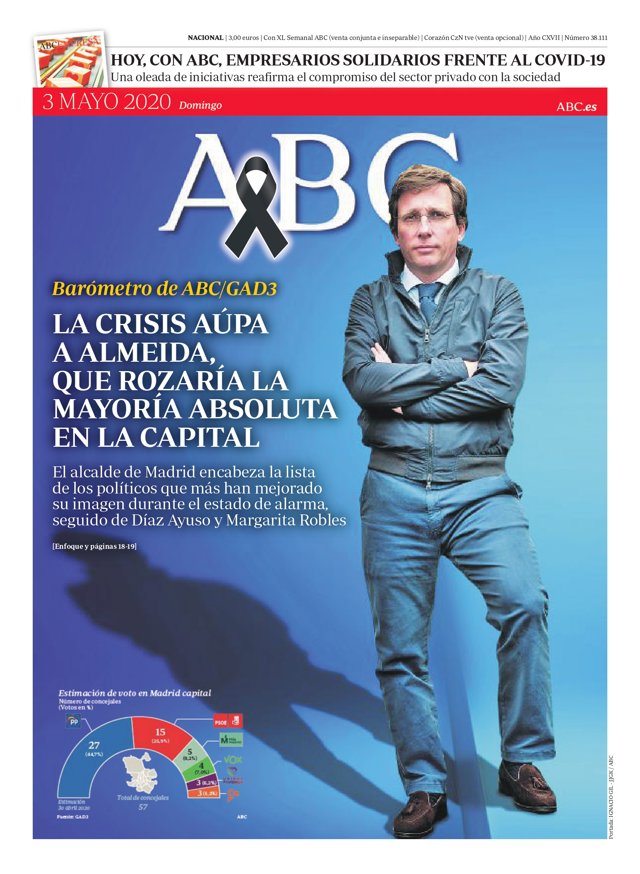 ABC: "La crisis aúpa a Almeida, que rozaría la mayoría absoluta en la capital"; "El alcalde de Madrid encabeza la lista de los políticos que más han mejorado su imagen durante el estado de alarma, seguido de Díaz Ayuso y Margarira Robles".