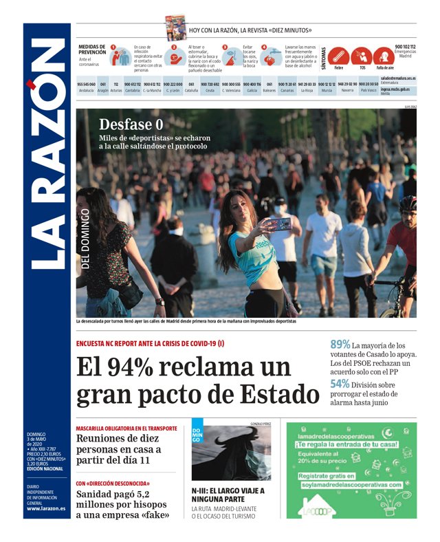 LA RAZÓN: "Desfase 0"; "Miles de 'deportistas' se echaron a la calle saltándose el protocolo"; "El 94% reclama un gran pacto de Estado"; "Reuniones de diez personas en casa a partir del día 11"; "Sanidad pagó 5,2 millones por hisopos a una empresa 'fake'".
