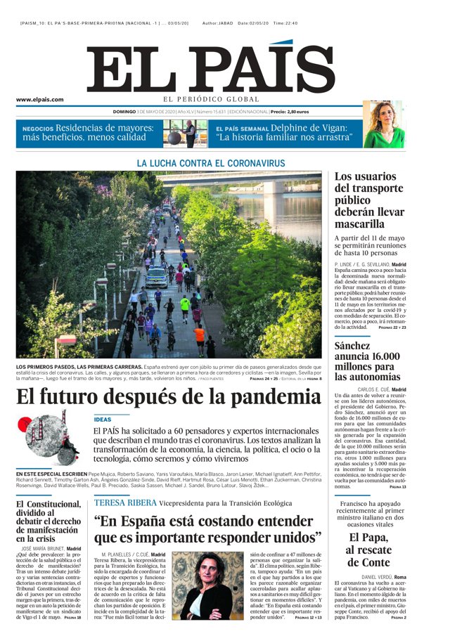 EL PAÍS: "Residencias de mayores: más beneficios, menos calidad"; "Delphine de Vigan: La historia familiar nos arrastra"; "El futuro después de la pandemia"; "El Constitucional, dividido al debatir el derecho de manifestación en la crisis"; "Teresa Ribera: En España está costando entender que es importante responder unidos"; "Los usuarios del transporte público deberán llevar mascarilla"; "Sánchez anuncia 16.000 millones para las autonomías"; "El Papa, al rescate de Conte".