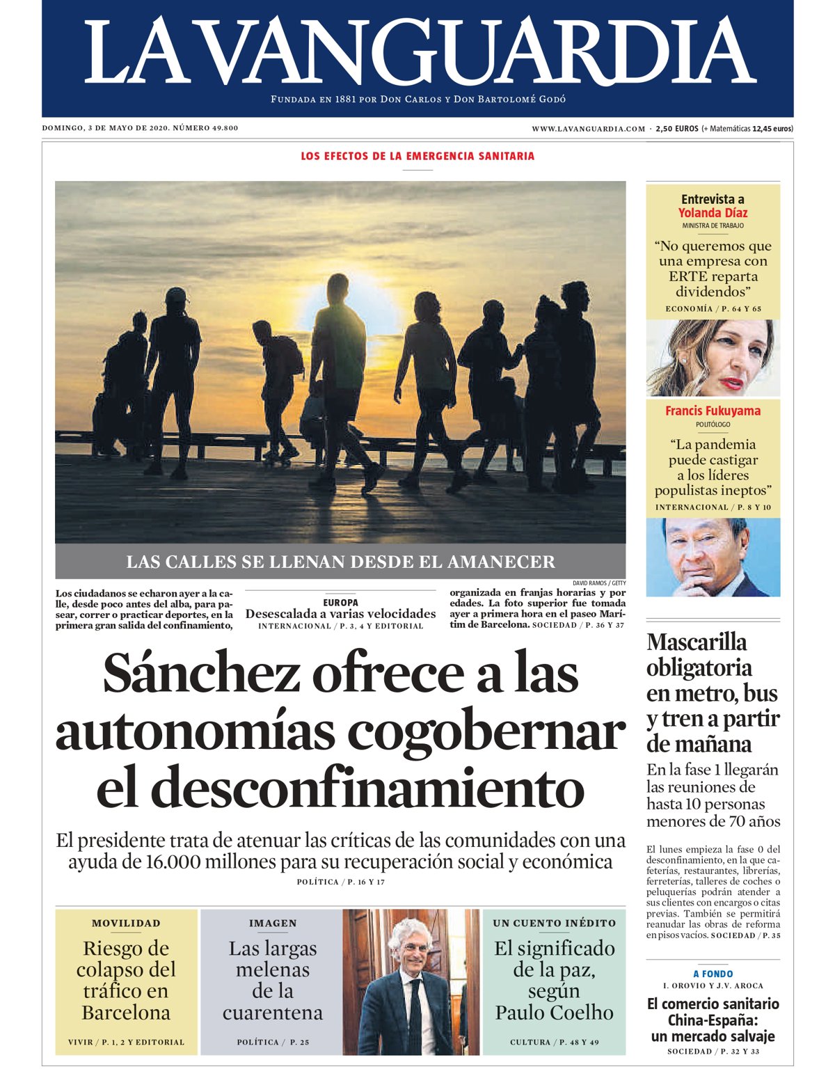 LA VANGUARDIA: "Las calles se llenan desde el amanecer"; "Sánchez ofreec a las autonomías cogobernar el desconfinamiento"; "Yolanda Díaz: No queremos que una empresa con ERTE reparta dividendos": "Fukuyama: La pandemia puede castigar a los líderes populistas ineptos": "Mascarilla obligatoria en metro, bus y tren a partir de mañana"; "Riesgo de colapso del tráfico en Barcelona"; "Las largas melenas de la cuarentena"; "El significado de la paz, según Paulo Coelho".