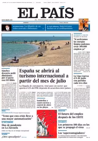 EL PAÍS: "España se abrirá al turismo internacional a partir del mes de julio"; "Sánchez descarta pedir dimisiones por el pacto con EH Bildu"; "Entrevista con el presidente de Iberdrola: 'Si aceleramos las energías limpias podemos crear 300.000 empleos ya'"; "La Liga regresa el 8 de junio con partidos cada tres días"; "El futuro del empleo después de los ERTE"; "Los primeros cien días en los que se propagó el virus".
