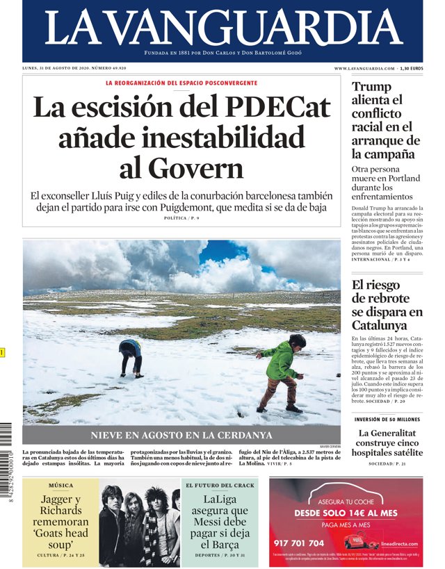 LA VANGUARDIA: "La escisión del PDECat añade inestabilidad al Govern", "Nieve en agosto en la Cerdanya", "Trump alienta el conflicto racial en el arranque de la campaña", "El riesgo de rebrote se dispara en Catalunya", "La Generalitat construye cinco hospitales satélite", "Jagger y Richards rememoran 'Goats head soup'", "LaLiga asegura que Messi debe pagar si deja el Barça".