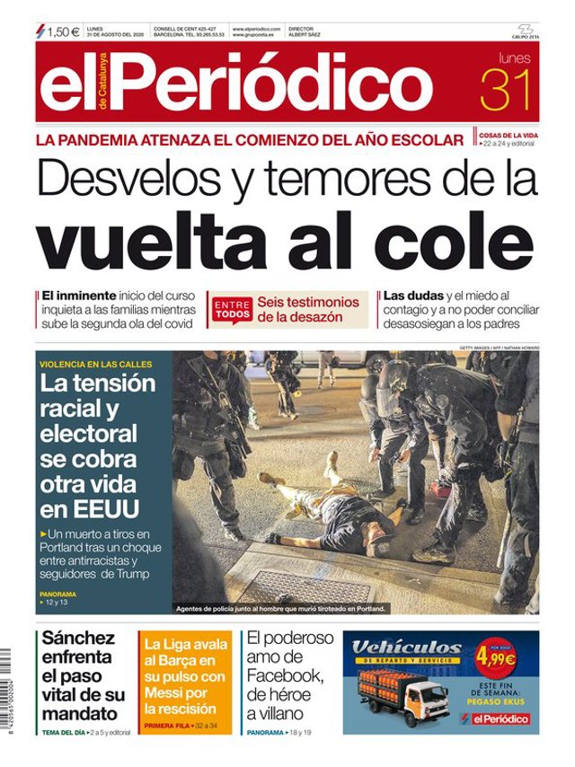 EL PERIÓDICO: "Desvelos y temores de la vuelta al cole", "La tensión racial y electoral se cobra otra vida en EEUU", "Sánchez enfrenta el paso vital de su mandato", "El poderoso amo de Facebook, de héroe a villano".