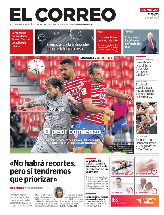 EL CORREO: "El peor comienzo. El Athletic se condena de nuevo en Granada con dos errores defensivos en un inicio de Liga desalentado"; "Idoia Mendia, vicelehendakari: No habrá recortes, pero sí tendremos que priorizar"; "La vacuna de Oxford reanuda los ensayos tras la enfermedad de un voluntario"; "Las oposiciones vuelven a ser una alternativa".