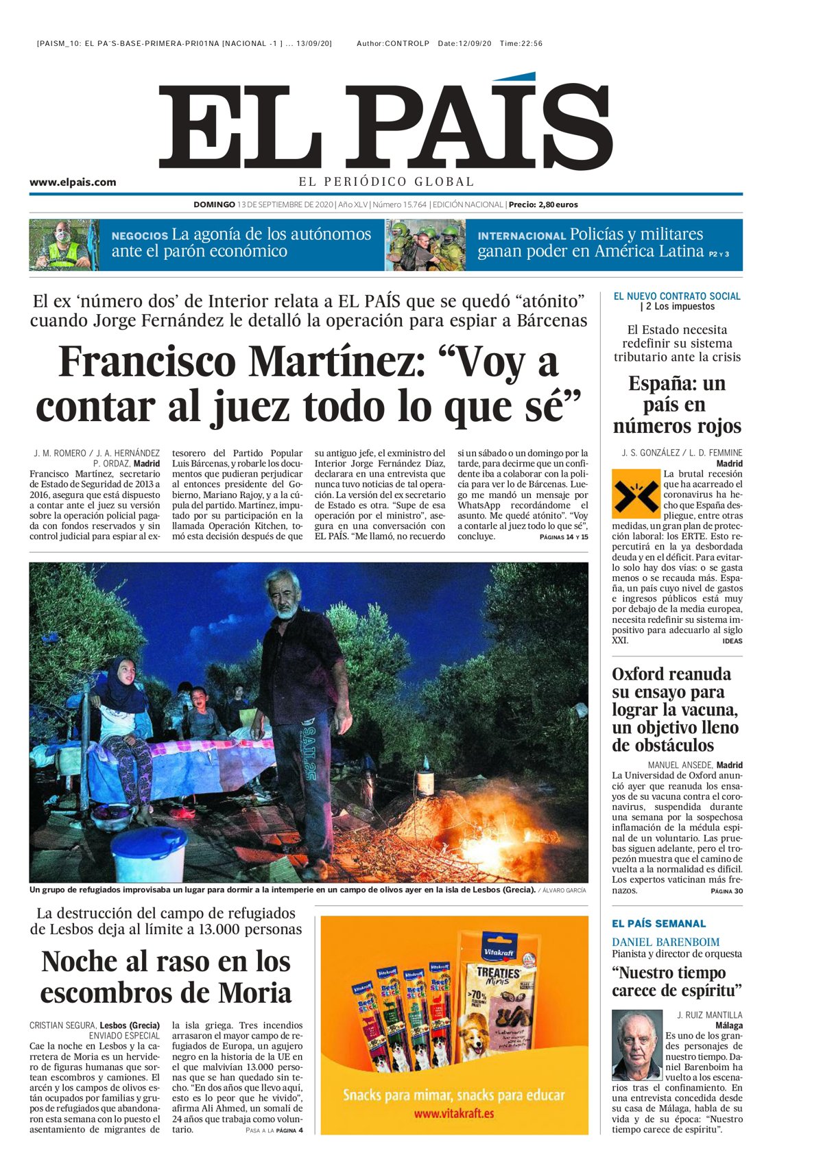 EL PAÍS: "Francisco Martínez: Voy a contar al juez todo lo que sé"; "Noche al raso en los escombros de Moria"; "Oxford reanuda su ensayo para lograr la vacuna, un objetivo lleno de obstáculos"; "España: un