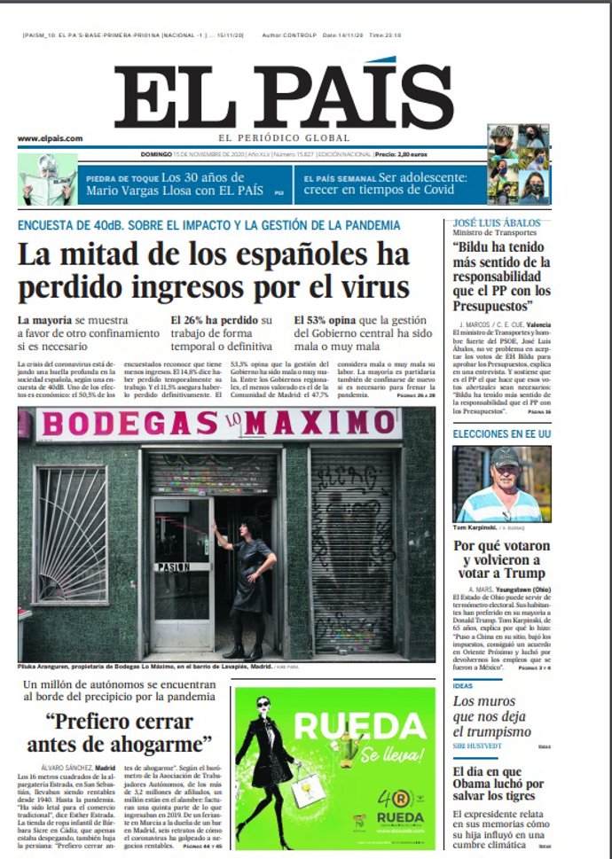EL PAÍS: "La mitad de los españoles ha perdido ingresos por el virus"; "'Prefiero cerrar antes de ahogarme'"; "José Luis Ábalos: 'Bildu ha tenido más sentido de la responsabilidad que el PP con los Presupuestos'".