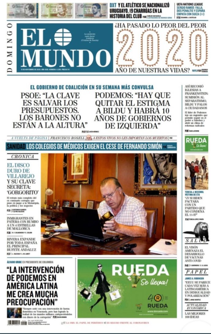 EL MUNDO: "PSOE: 'La clave es salvar los Presupuestos, los barones no están a la altura"; "Podemos: 'Hay que quitar el estigma a Bildu y habrá 10 años de Gobiernos de izquierda'"; "El disco duro de Villarejo y su clave secreta: 'Gorgorito'".