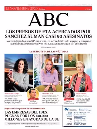 ABC: "Los presos de ETA acercados por Sánchez suman casi 90 asesinatos. Los beneficiados son 105, una veintena con delitos de sangre, y ninguno ha colaborado para resolver los 378 asesinatos aún sin esclarecer"; "Las empresas del IBEX pugnan por los 140.000 millones en ayudas de la UE".