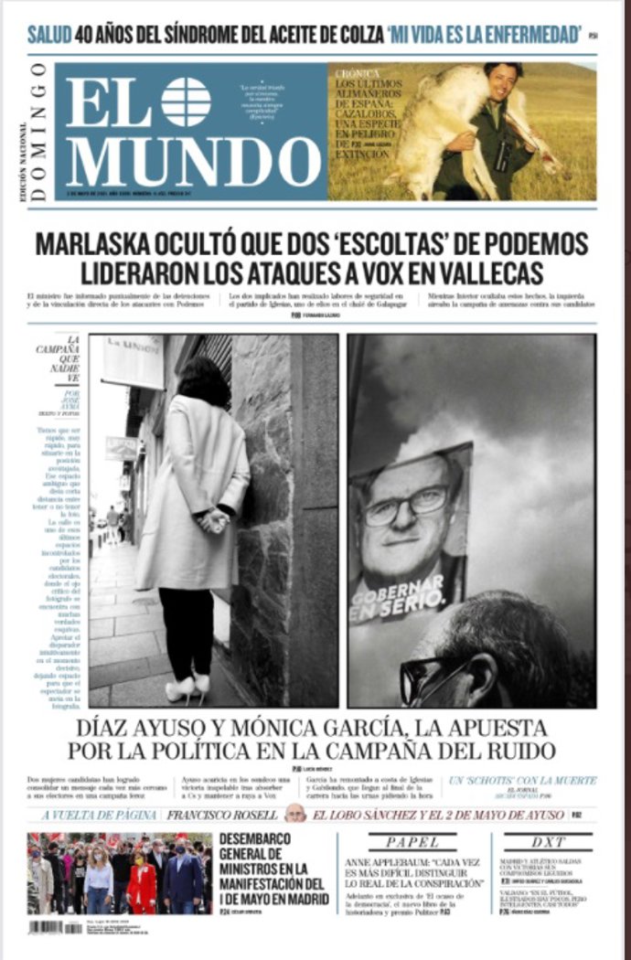 EL MUNDO: "Marlaska ocultó que dos 'escoltas' de Podemos lideraron los ataques a Vox en Vallecas"; "Díaz Ayuso y Mónica García, la apuesta por la política en la campaña del ruido".