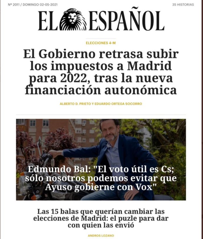 EL ESPAÑOL: "El Gobierno retrasa subir los impuestos a Madrid para 2022, tras la nueva financiación autonómica"; "Edmundo Bal: 'El voto útil es Cs; sólo nosotros podemos evitar que Ayuso gobierne con Vox"; "Las quince balas que querían cambiar las elecciones de Madrid: el puzzle para dar con quien las envió".