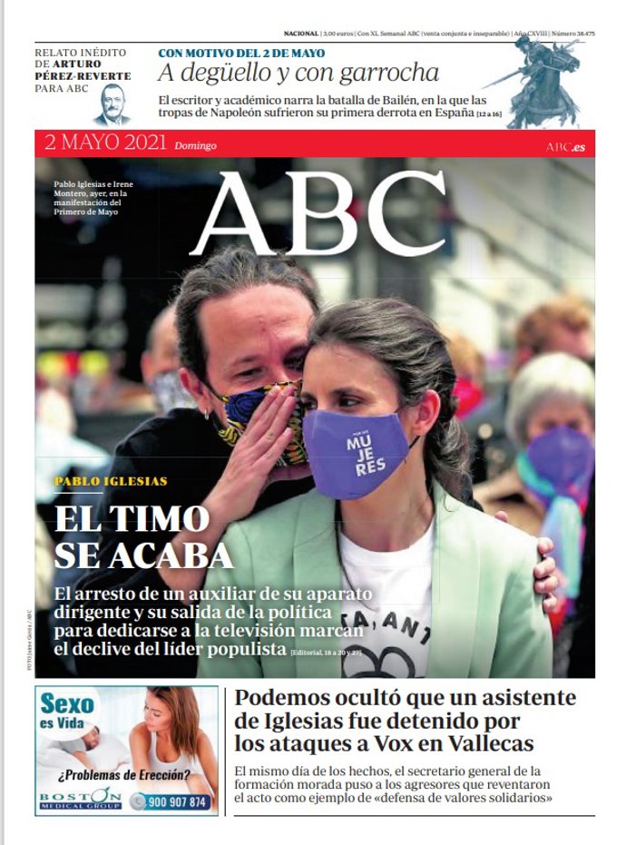 ABC: "Pablo Iglesias. El timo se acaba"; "El arresto de un auxiliar de su aparato dirigente y su salida de la política para dedicarse a la televisión marcan el declive del líder populista"; "Podemos ocultó que un asistente de Iglesias fue detenido por los ataques a Vox en Vallecas".