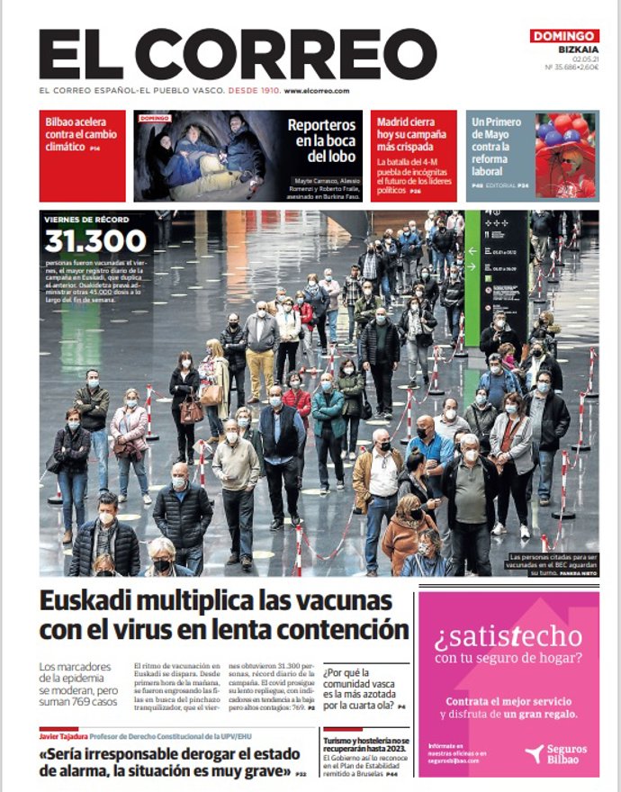 EL CORREO: "Euskadi multiplica las vacunas con el virus en lenta contención"; "Javier Tajadura, profesor de Derecho Constitucional: 'Sería irresponsable derogar el estado de alarma, la situación es muy grave".