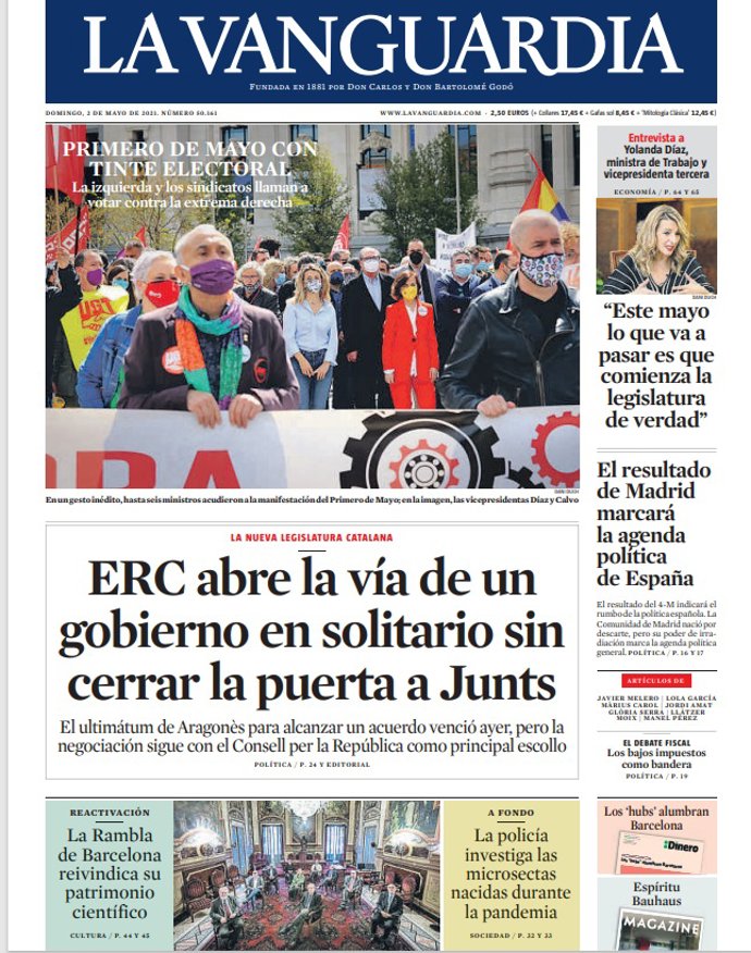 LA VANGUARDIA: "Primero de mayo con tinte electoral"; "ERC abre la vía de un gobierno en solitario sin cerrar la puerta a Junts"; "Yolanda Díaz: 'Este mayo lo que va a pasar es que comienza la legislatura de verdad'"; "El resultado de Madrid marcará la agenda política de España".