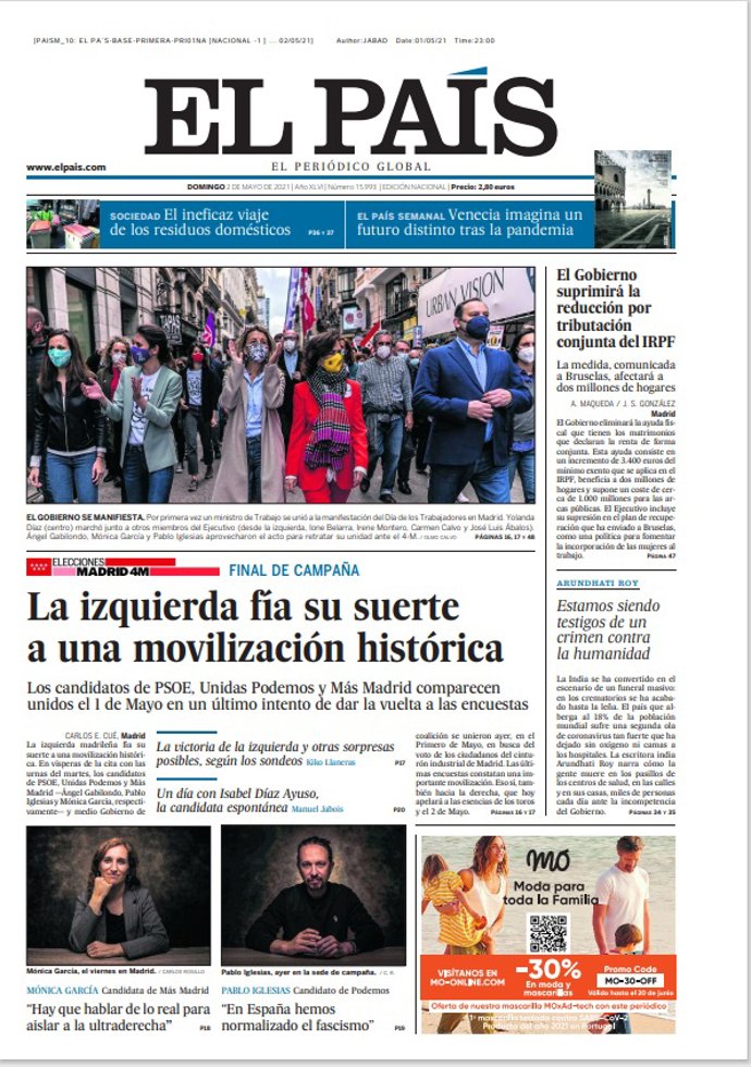 EL PAÍS: "La izquierda fía su suerte a una movilización histórica"; "El Gobierno suprimirá la reducción por tributación conjunta del IRPF"; "Mónica García: 'Hay que hablar de lo real para aislar a la ultraderecha"; "Pablo Iglesias: 'En España hemos normalizado el fascismo".