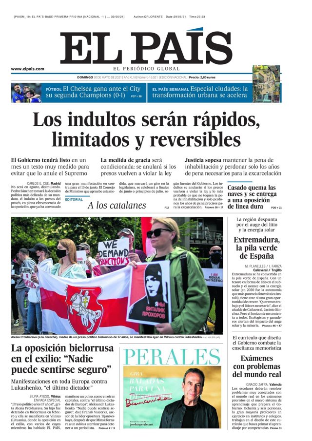 EL PAÍS: "Los indultos serán rápidos, limitados y reversibles"; "Casado quema las naves y se entrega a una oposición de línea dura"; "Extremadura, la pila verde de España"; "La oposición bielorrusa en el exilio: 'Nadie puede sentirse seguro'"; "Exámenes con problemas del mundo real".