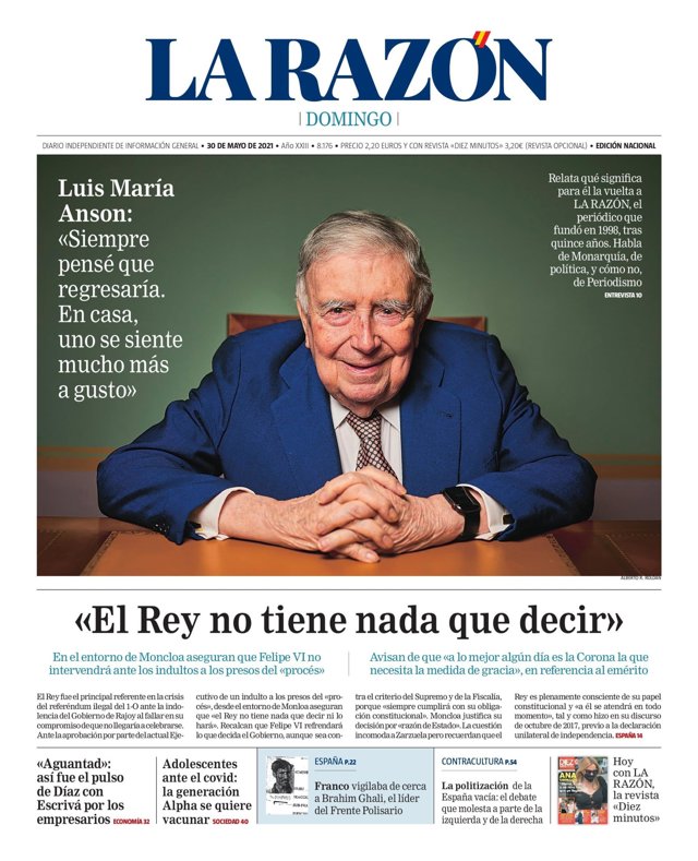 LA RAZÓN: "Luis María Anson: 'Siempre pensé que regresaría. En casa, uno se siente mucho más a gusto"; "El Rey no tiene nada que decir"; "'Aguantad': así fue el pulso de Díaz con Escrivá por los empresarios"; "Adolescentes ante el covid: la generación Alpha se quiere vacunar"; "Franco vigilaba de cerca a Brahim Ghali, el líder del Frente Polisario"; "La politización de la España vacía: el debate que molesta a parte de la izquierda y de la derecha".