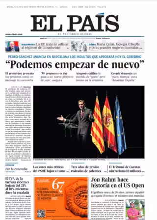 EL PAÍS: "Sánchez: 'Podemos empezar de nuevo'"; "El IVA de la factura eléctrica bajará del 21% al 10% mientras dure la escalada"; "Jon Rahm hace historia en el US Open"; "La UE trata de asfixiar al régimen de Lukashenko".