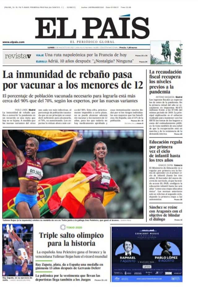 EL PAÍS: "La inmunidad de rebaño pasa por vacunar a los menores de 12"; "La recaudación fiscal recupera los niveles previos a la pandemia"; "Educación regula por primera vez el ciclo de infantil hasta los tres años"; "Sánchez se reúne con Aragonès con el objetivo de blindar el diálogo"; "Triple salto olímpico para la historia".