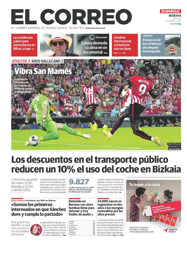 EL CORREO: "Vibra San Mamés"; "Las residencias y pisos para universitarios en Bilbao, a tope"; "Condena internacional a la barbarie rusa en Izium"; "El lento revivir de La Palma un año después de la erupción"; "Los descuentos en el transporte público reducen un 10% el uso del coche en Bizkaia"; "Itxaso Atutxa: 'Somos los primeros interesados en que Sánchez dure y cumpla lo pactado'"; "Detenido en Bermeo con cinco bombas listas para detonar y tres fusiles de asalto"; "24.000 vascos se enganchan en dos años a las energías renovables por los altos precios".
