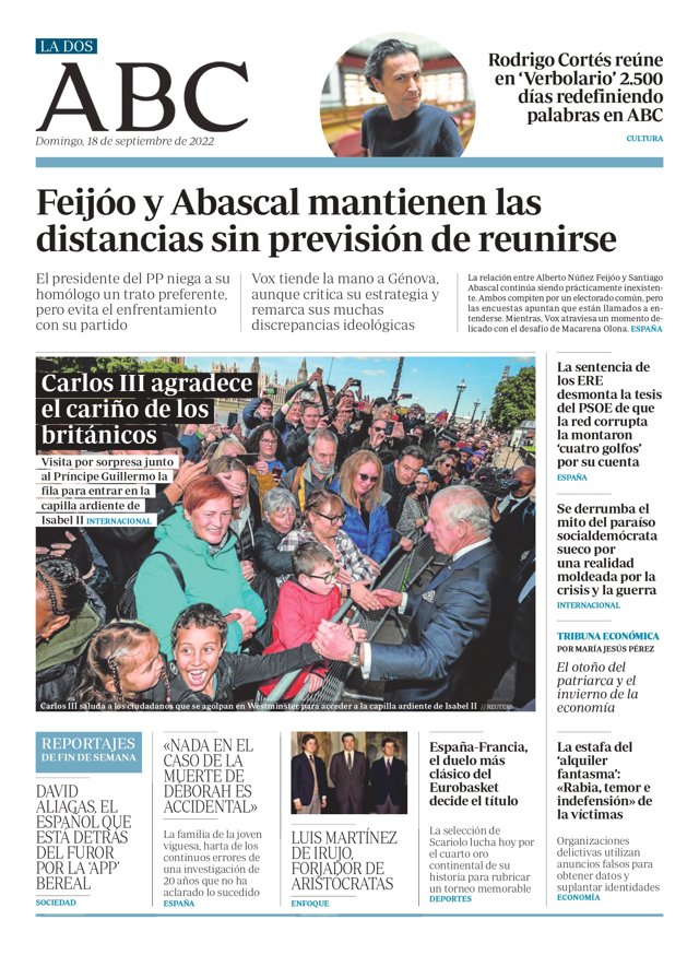 ABC: "Feijóo y Abascal mantienen las distancias sin previsión de reunirse"; "Rodrigo Cortés reúne en 'Verbolario' 2.500 días redefiniendo palabras en ABC"; "Carlos III agradece el cariño de los británicos"; "La sentencia de los ERE desmonta la tesis del PSOE de que la red corrupta la montaron 'cuatro golfos' por su cuenta"; "Se derrumba el mito del paraíso socialdemócrata sueco por una realidad moldeada por la crisis y la guerra"; "La estafa del 'alquiler fantasma': 'Rabia, temor e indefensión' de la víctimas"; "España-Francia, el duelo más clásico del Eurobasket decide el título".