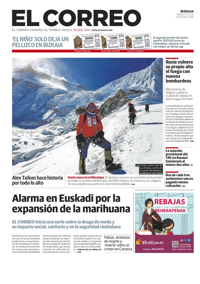 EL CORREO: "Alarma en Euskadi por la expansión de la marihuana'; "Rusia vulnera su propio alto el fuego con nuevos bombardeos"; "La estación provisional del TAV en Basauri funcionará al menos dos años"; "Dos de cada tres autónomos vascos pagarán menos cotización"; "Alex Txikon hace historia por todo lo alto".