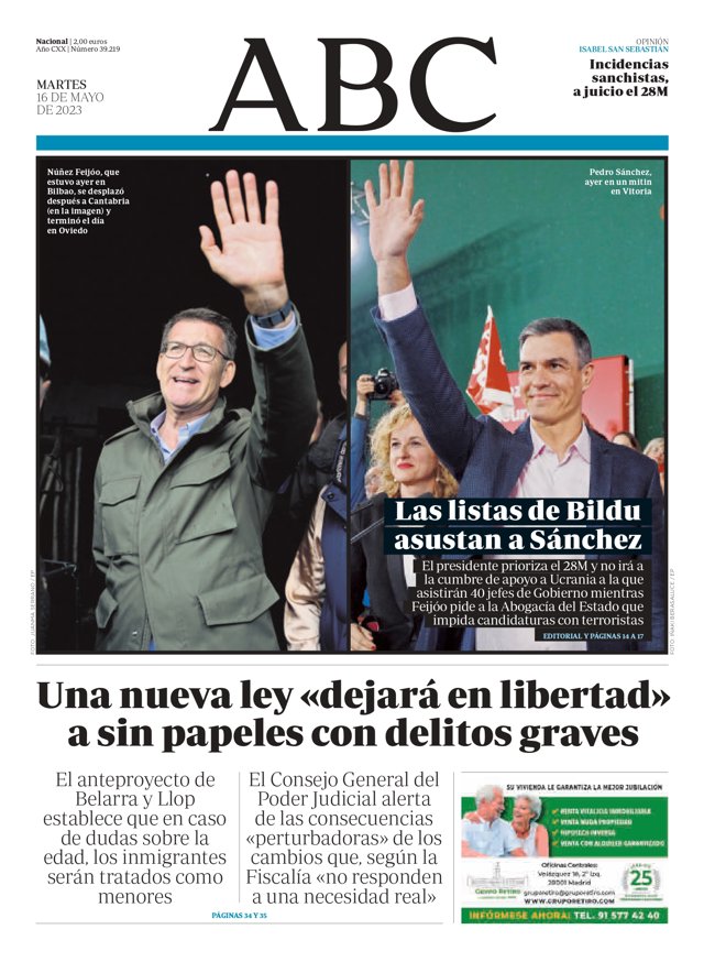 ABC: "Las listas de Bildu asustan a Sánchez"; "Una nueva ley 'dejará en libertad' a sin papeles con delitos graves"; "El ingreso mínimo sólo llegó el año pasado al 76% de los hogares previstos"; "Bruselas eleva su previsión de crecimiento para España, pero cree que no cumplirá las reglas fiscales"; "El 28M toma San Isidro: abrazos de Díaz con Más Madrid y sólo fotos con Podemos".