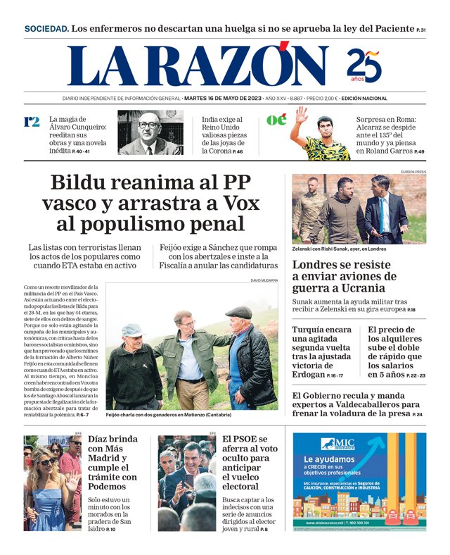 LA RAZÓN: "Bildu reanima al PP vasco y arrastra a Vox al populismo penal"; "Londres se resiste a enviar aviones de guerra a Ucrania"; "Turquía encara una agitada segunda vuelta tras la ajustada victoria de Erdogan"; "El precio de los alquileres sube el doble de rápido que