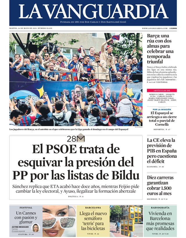 LA VANGUARDIA: "El PSOE trata de esquivar la presión del PP por las listas de Bildu"; "Barça: una rúa con dos almas para celebrar una