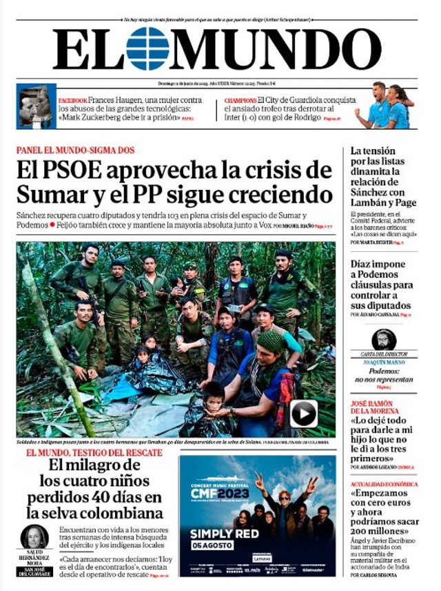 EL MUNDO: "El PSOE aprovecha la crisis de Sumar y el PP sigue creciendo"; "La tensión por las listas dinamita la relación de Sánchez con Lambán y Page"; "Díaz impone a Podemos cláusulas para controlar a sus diputados"; "El milagro de los cuatro niños perdidos 40 días en la selva colombiana".