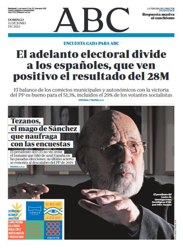 ABC: "El adelanto electoral divide a los españoles, que ven positivo el resultado del 28M"; "Tezanos, el mago de Sánchez que naufraga con las encuestas"; "El PSOE disfraza con un cierre de filas la fractura abierta por las listas del 23J"; "Doñana, un paraíso asediado por la inacción de la Junta del PSOE".
