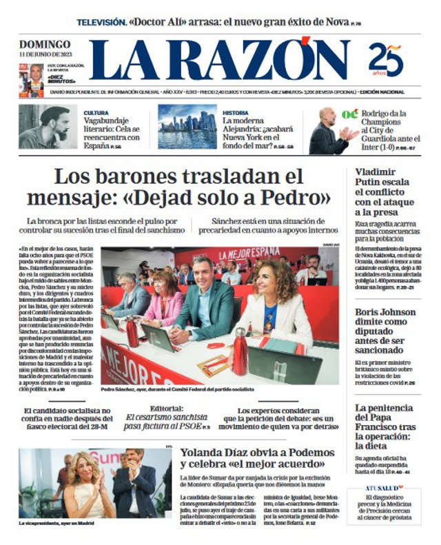 LA RAZÓN: "Los barones trasladan el mensaje: 'Dejad solo a Pedro'"; "Yolanda Díaz obvia a Podemos y celebrar 'el mejor acuerdo'", "Vladimir Putin escala el conflicto con el ataque a la presa"; "Boris Johnson dimite como diputado antes de ser sancionado: "La penitencia del Papa Francisco tras la operación: la dieta".