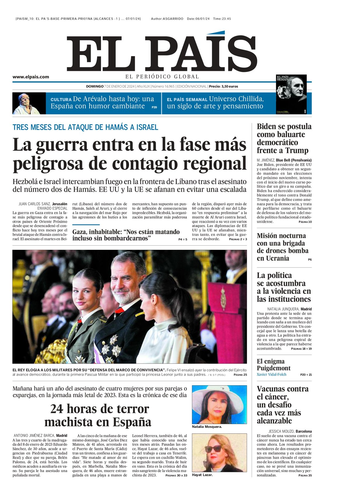 EL PAÍS: "La guerra entra en la fase más peligrosa de contagio regional"; "Biden se postula como baluarte democrático frente a Trump"; "Misión nocturna con una brigada de drones bomba en Ucrania"; "La política se acostumbra a la violencia en las instituciones"; "Vacunas contra el cáncer, un desafío cada vez más alcanzable".