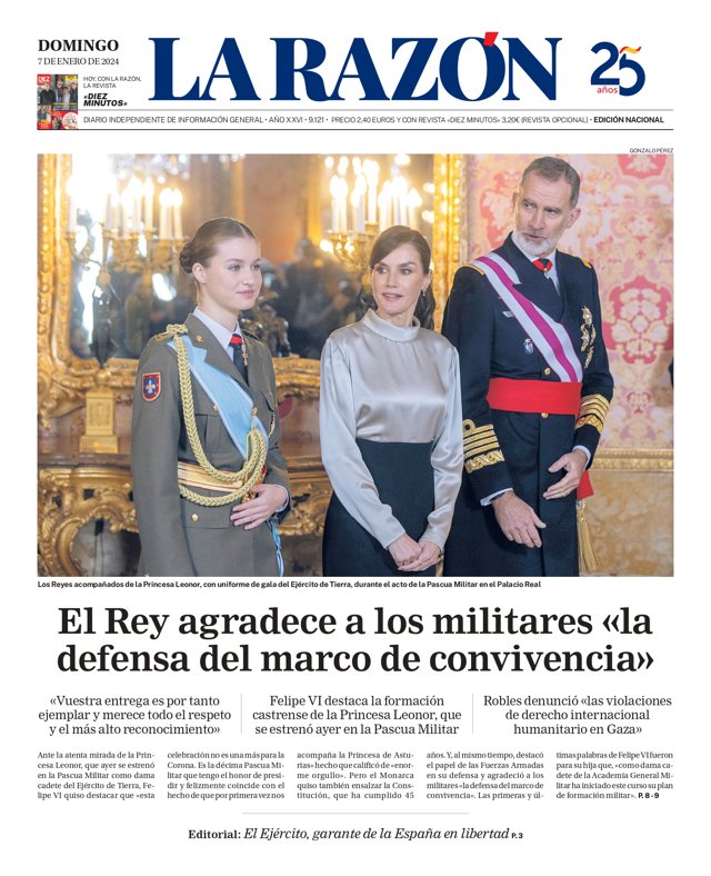 LA RAZÓN: "El Rey agradece a los militares la defensa del marco de convivencia"; "El Ejército, garante de la España en libertad"; "Robles denunció las violaciones de derecho internacional humanitario en Gaza".