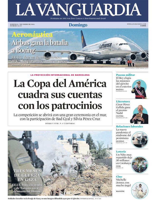 LA VANGUARDIA: "La Copa del América cuadra sus cuentas con los patrocinios"; "EE.UU. busca la ayuda de Turquía para desmantelar Hamás"; "El Rey elogia las misiones del Ejército en el exterior"; "César Pérez Gellida gana el premio Nadal", "La nueva pandemia: el síndrome del pesimismo".